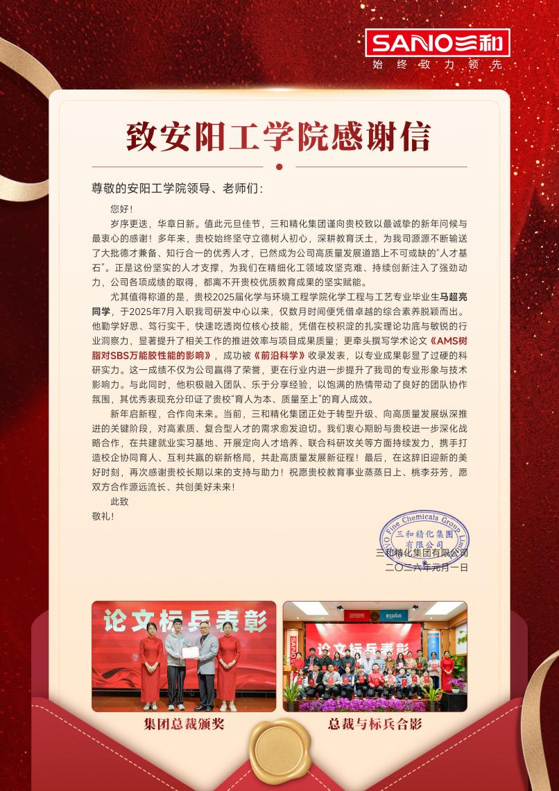 近日,我校收到三和精化集团有限公司发来的感谢信,信中表达了对学校人才培养工作的肯定,更是对我院2025届化学工程与工艺专业本科毕业生马超亮的表现给予高度评价。